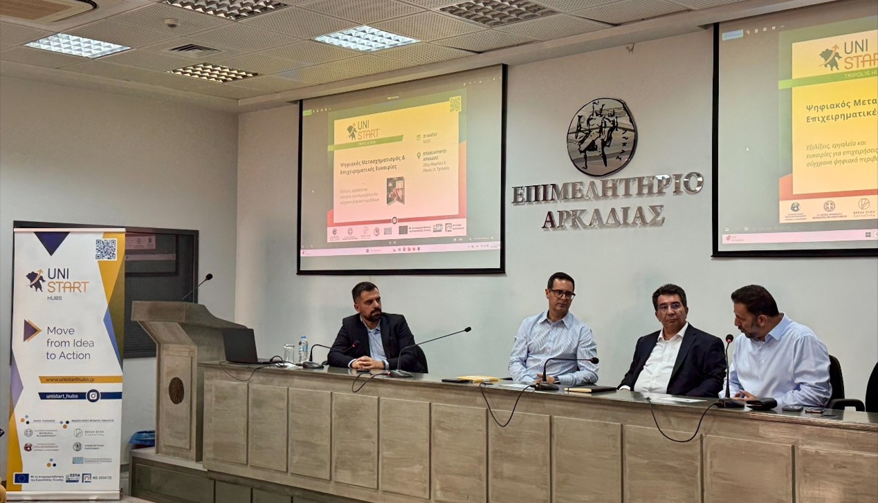 Με επιτυχία πραγματοποιήθηκε η 9η εκδήλωση ενημέρωσης κοινού των Unistart Hubs, με τίτλο «Ψηφιακός Μετασχηματισμός και Επιχειρηματικές Ευκαιρίες», την Τετάρτη 21 Μαΐου 2025, στην αίθουσα εκδηλώσεων του Επιμελητηρίου Αρκαδίας στην Τρίπολη. Η εκδήλωση επικεντρώθηκε στον ρόλο των τεχνολογικών εξελίξεων και της καινοτομίας στη διαμόρφωση νέων επιχειρηματικών ευκαιριών για μικρές και μεσαίες επιχειρήσεις, προσελκύοντας σημαντικό ενδιαφέρον από τον επιχειρηματικό και ακαδημαϊκό κόσμο της περιοχής.