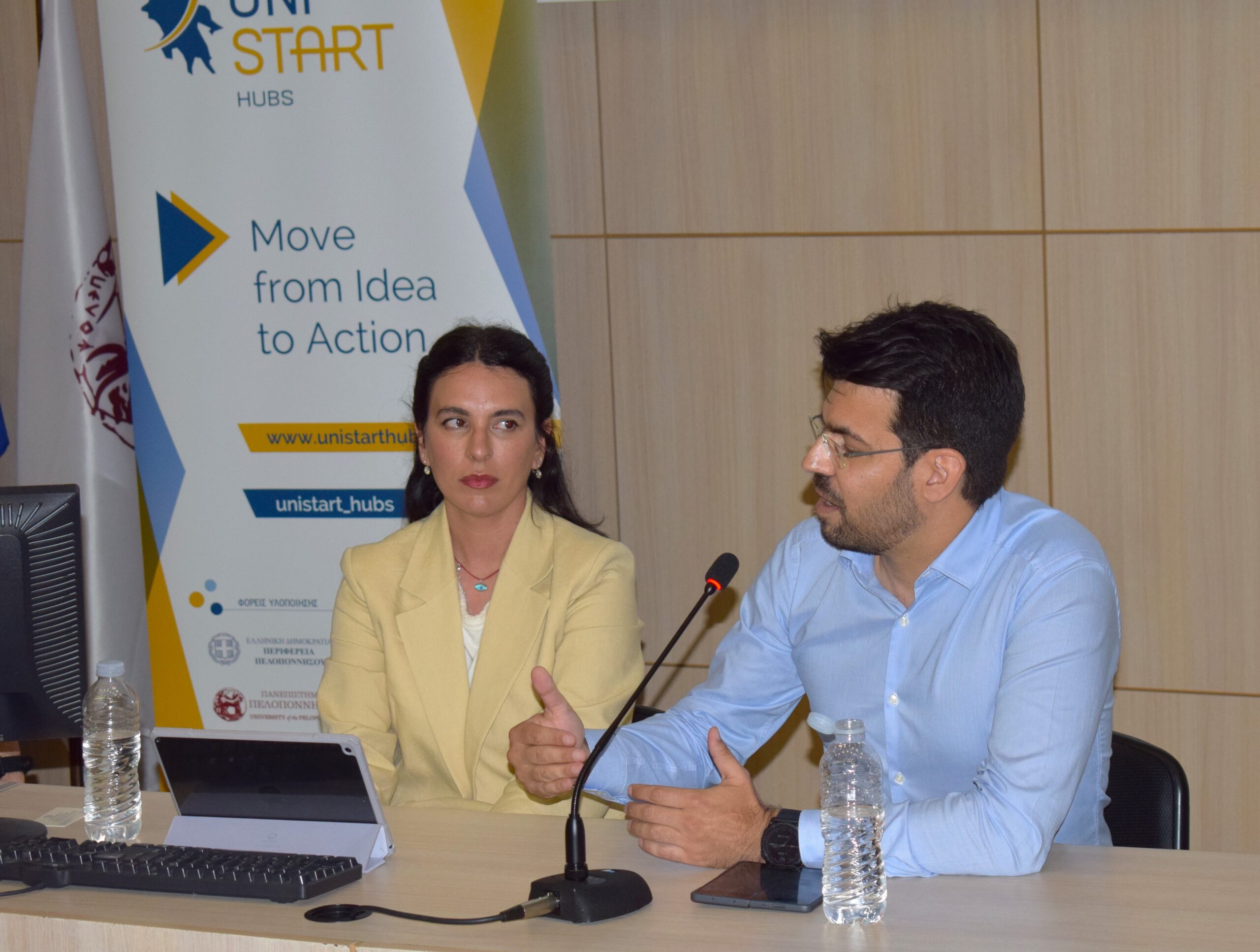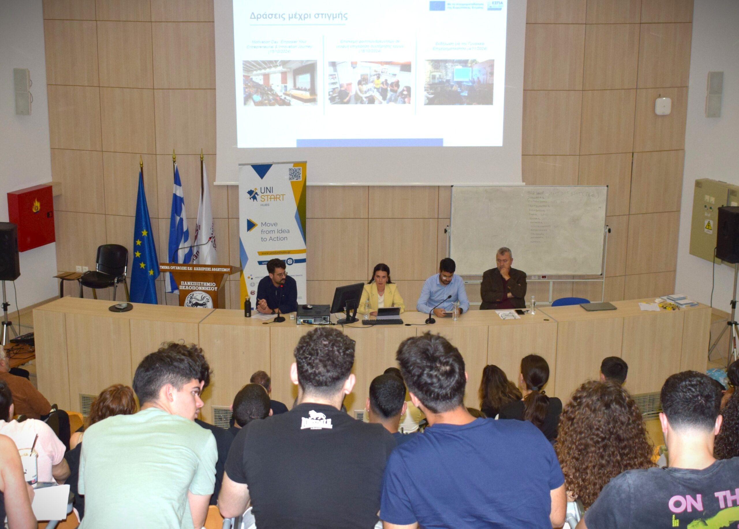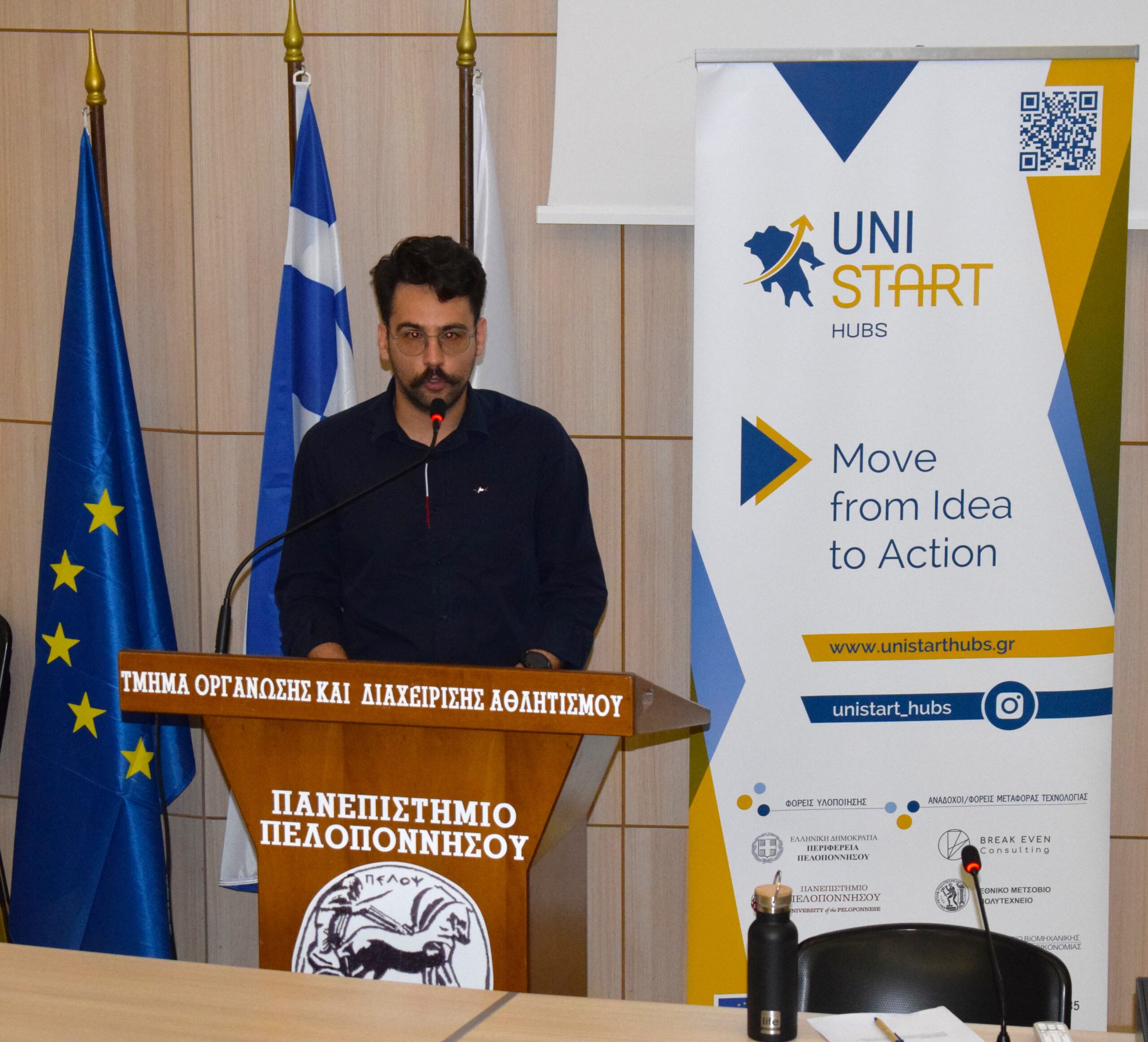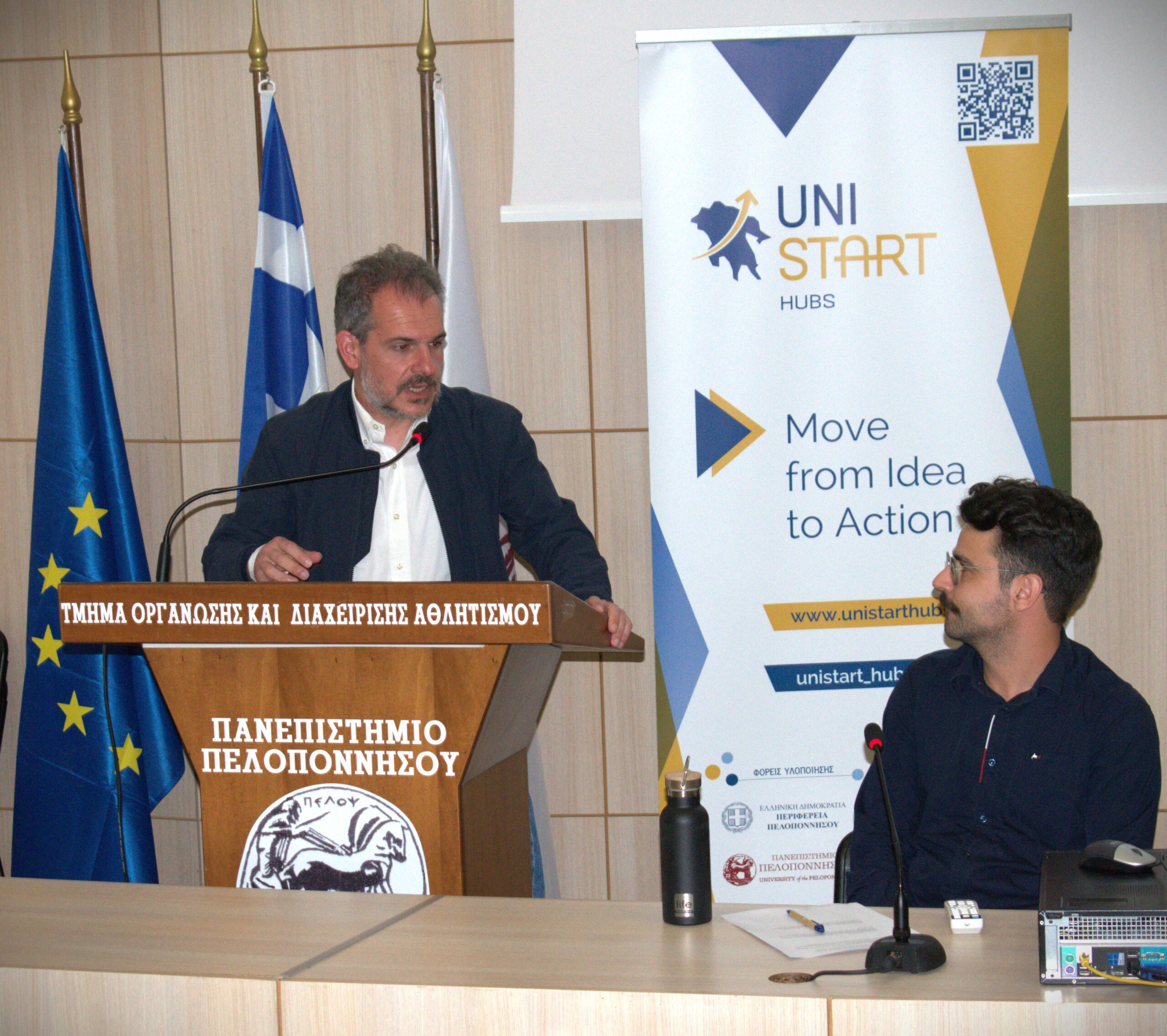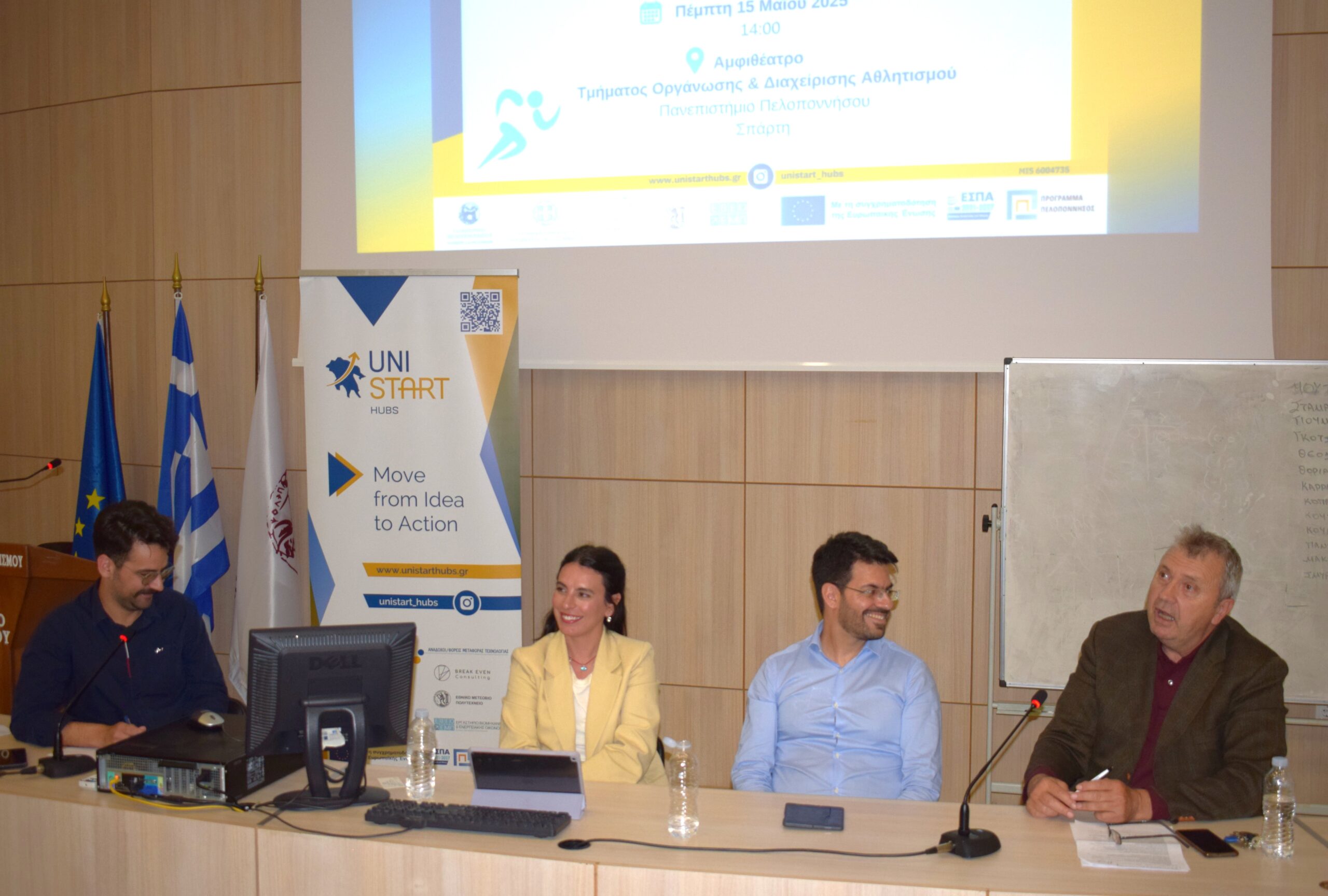 Με μεγάλη επιτυχία πραγματοποιήθηκε η εκδήλωση ενημέρωσης κοινού των UniStart Hubs με τίτλο «Αθλητισμός και Επιχειρηματικές Ευκαιρίες», την Πέμπτη 15 Μαΐου 2025, στο Αμφιθέατρο του Πανεπιστημίου Πελοποννήσου στη Σπάρτη. Η δράση ανέδειξε τη δυναμική που δημιουργείται στον τομέα του αθλητισμού όταν αυτός συναντά την επιχειρηματικότητα, την καινοτομία και τη βιώσιμη ανάπτυξη. Στην εκδήλωση συμμετείχαν περισσότεροι από 70 φοιτητές, ερευνητές, μέλη ΔΕΠ, καθώς και εκπρόσωποι της τοπικής αυτοδιοίκησης και επιχειρηματικής κοινότητας, ενώ οι φοιτητές έδειξαν ιδιαίτερο ενδιαφέρον για τις υπηρεσίες και τις ευκαιρίες που προσφέρει το οικοσύστημα UniStart.
